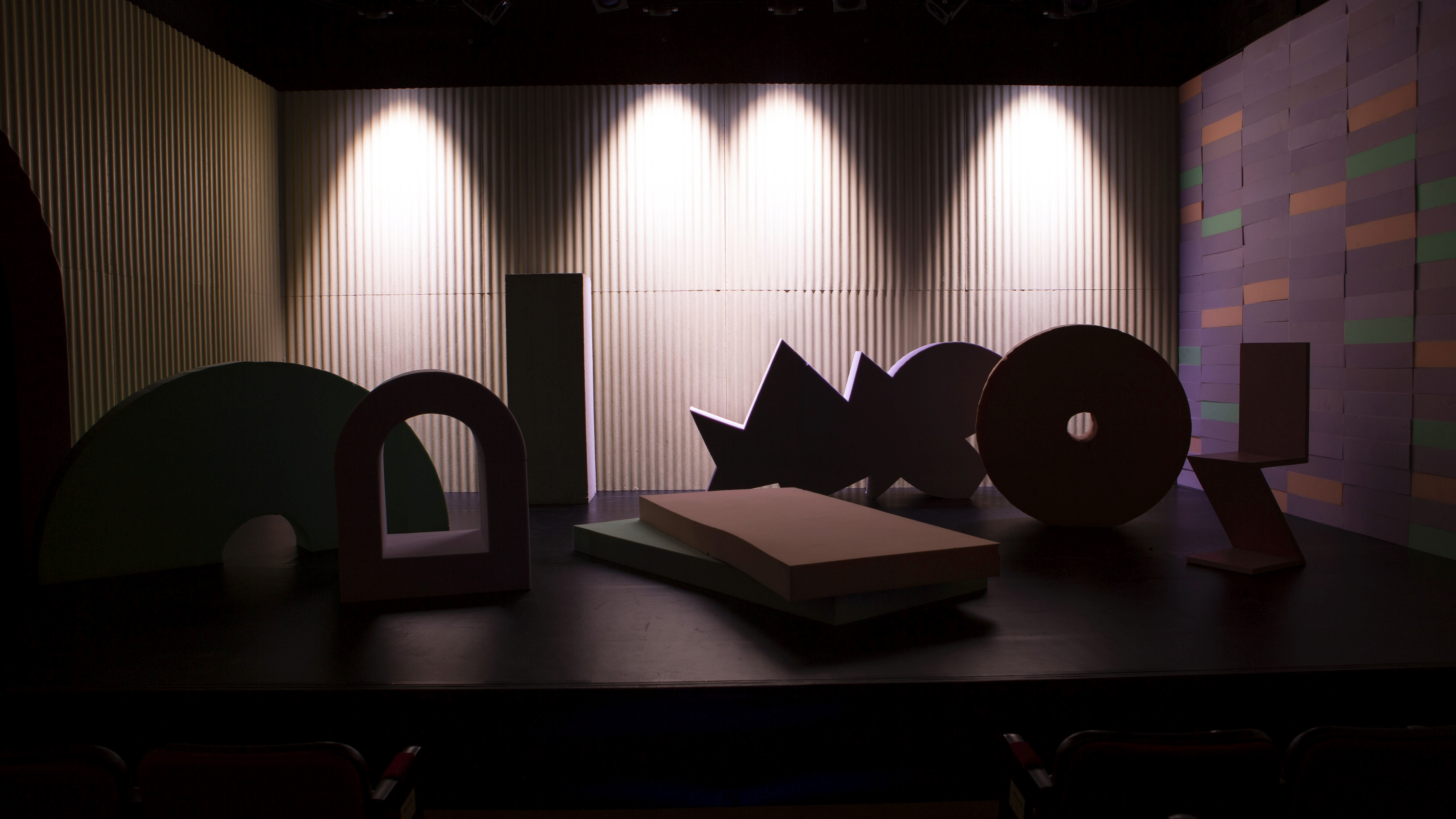 The novel Trainspotting based in Edinburgh, became known worldwide because of the film made in 1996. This is due to the fact that British black comedy has used a completely new visual scene in which it portrays the hallucinations of heroin addict youngsters from their own perspective, following all their junkie visions. Few people know, but the theatrical adaptation came earlier than the filmmaking itself. At the Thalia Theater in Budapest, the work was staged by Csaba Horváth with whom we created the scenery together. For the director who is mostly known in the physical theater genre, every part of the scenery became a central element of the work which is dynamized by the play of the characters. The play with four actors is a chamber piece that gives an abstract presentation of the struggles of young people who are unable to quit drug addiction in a depressing, tight space. The piece bounces between two dimensions, according to the actors' state of mind: the frustrating gray world of sobriety is depicted by run-down corrugated walls, while the ground loss and heightened perception of the shots are evident in the soft sponge scenery and vibrant colors. The use of lights also helps to visualize the muted perception of the characters, because while in soberity the illumination of the scenery is monochrome, the full range of colors only opens after the effect of the drug. This effect builds on the phenomenon in which, under the influence of addiction things really lose their meaning and can only become meaningful and exciting again from substance use. The Edinburgh scene, the city-specific brick architecture is evoked by a sponge wall that can be broken down into its elements, which actually crumbles down at the of the play to gain symbolic meaning.